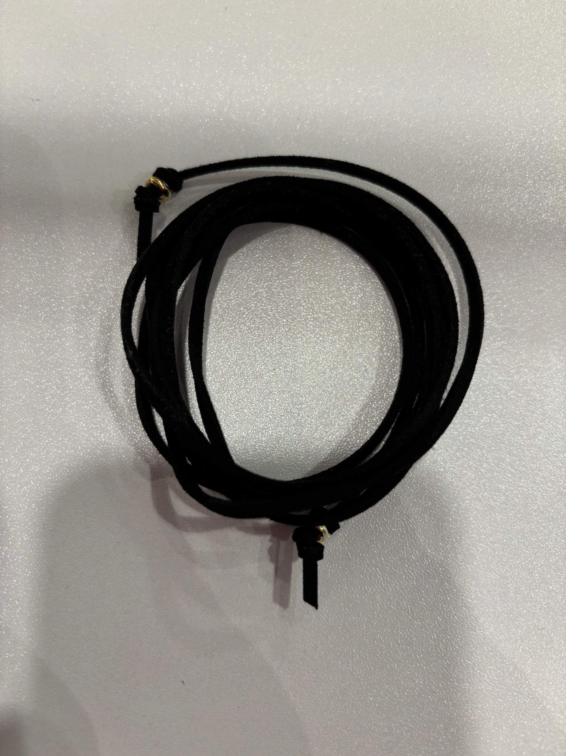 Cordino in alcantara rifinito con sferette in acciaio inossidabile placcato oro.