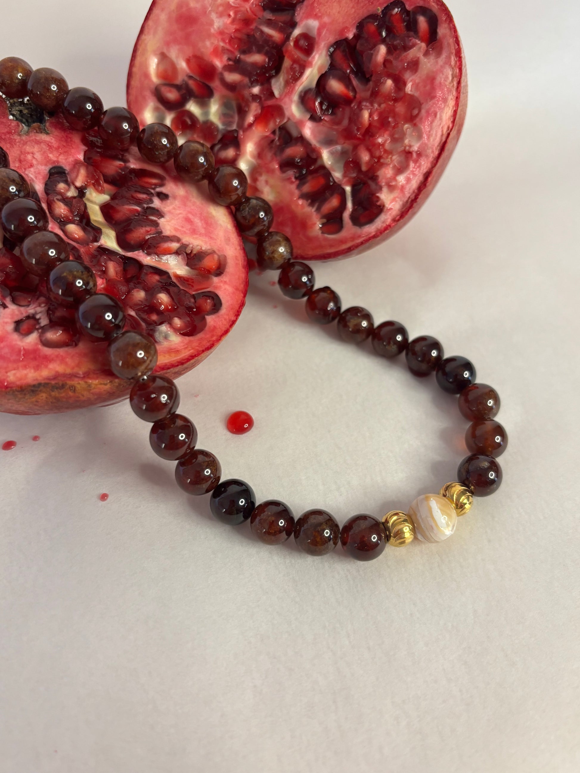 Collana Amelia: un gioiello unico e raffinato in granato hessonite e sfera centrale in madreperla cappuccino.