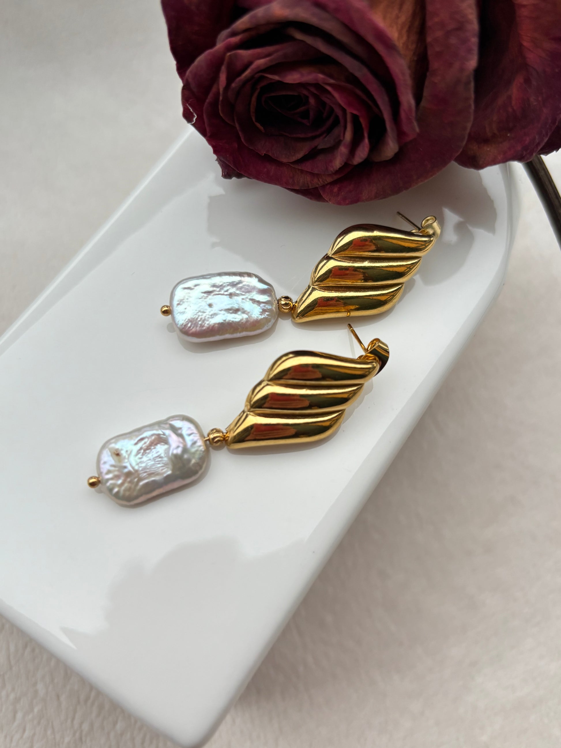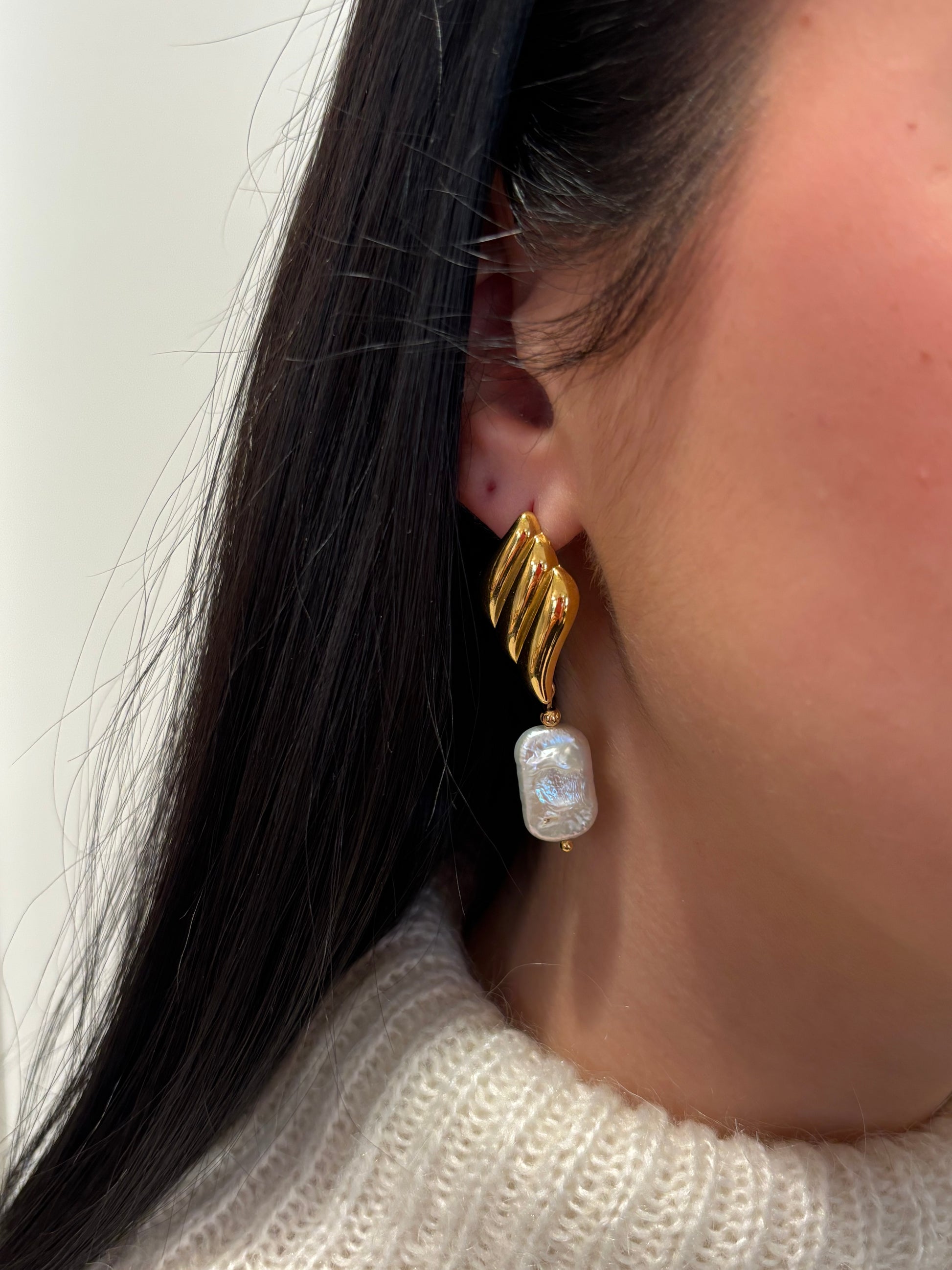 Orecchini Agata in acciaio inossidabile placcato oro e madreperla. La combinazione di materiali preziosi e la forma semplice creano un look moderno e sofisticato.